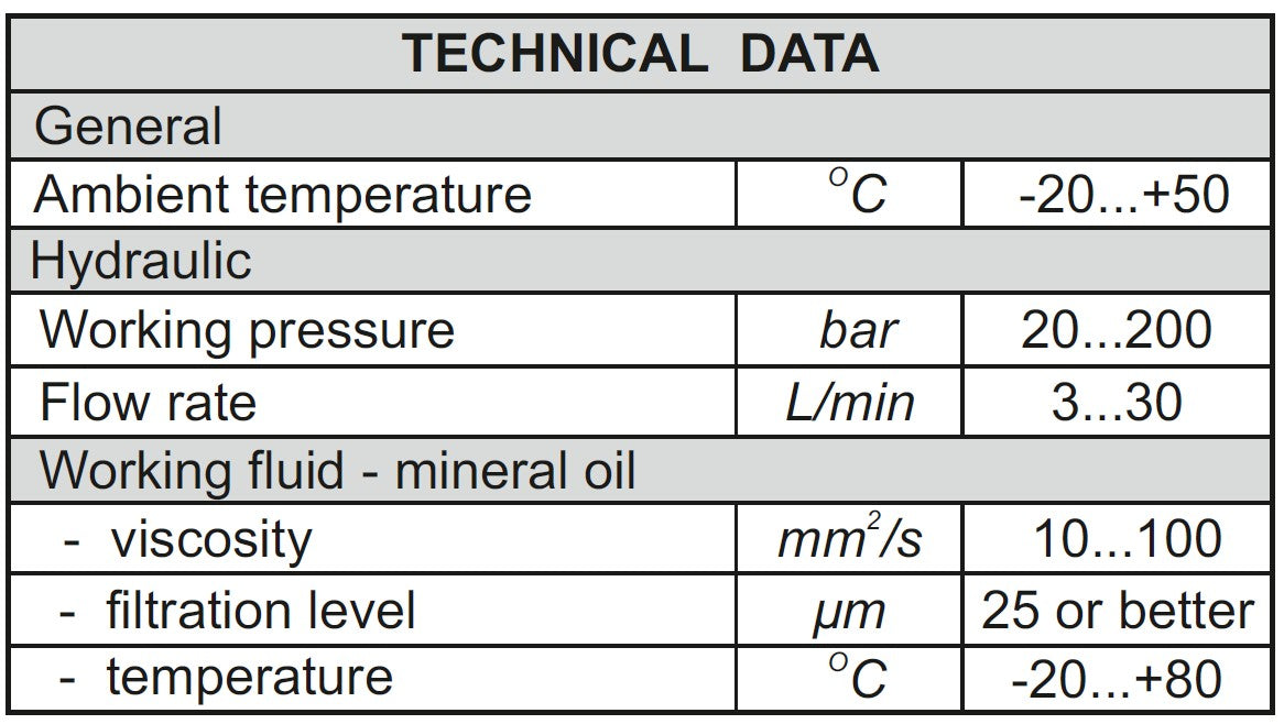 Arbeitsmedium: Viskosität - 10...100 mm²/s. Temperaturbereich: -20 °C...+80 °C. Absolute Filtration: 25 μm.